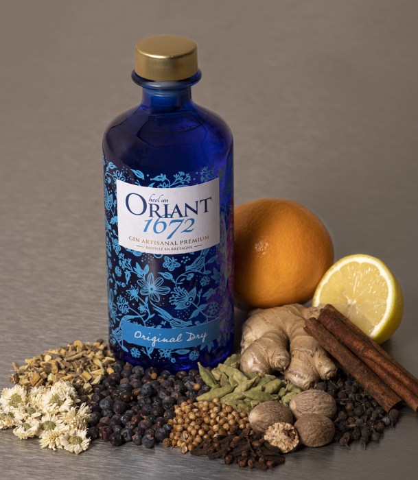 Une subtile combinaison de 17 composants : genièvre, épices, aromates, plantes et agrumes, zestes de citron, orange amère et gingembre frais … Des plantes traditionnellement utilisées dans la pharmacopée Bretonne : réglisse, angélique, camomille, reine des prés, fleur de sureau … et des épices d’Extrême-Orient pour rappeler qu’à la fin du 17ème et au début du 18ème siècle la Bretagne était la plaque tournante des épices du royaume.